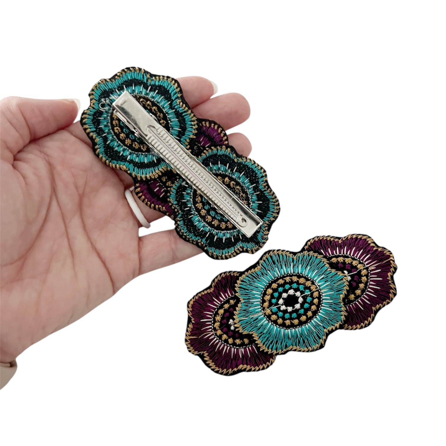 Flowers are embroidered and added to a silver alligator clip.